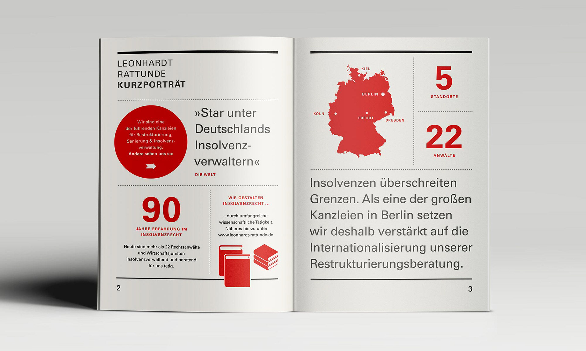 Die Berliner Kanzlei Leonhardt Rattunde erhielt durch eine Broschüre mit wechselbarem Umschlag einen individuellen Auftritt für jeden der fünf Standtorte.